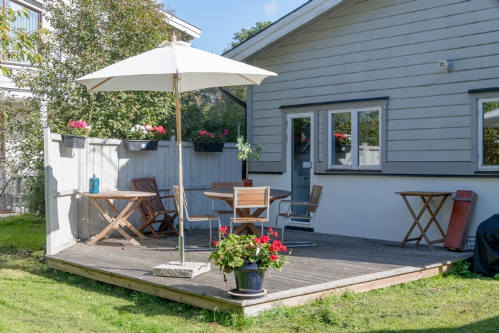 Uteplats Uteplatsen nås från köket. Den är byggd med trätrall och har utemöbler samt grill. Solen ligger på från lunch och framåt kvällen.