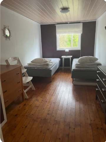 Vi har en stuga med två sovrum där 2 st 90 sängar i vardera rum finns. I Vardagsrumet finns en bäddsoffa med plats för 2 samt kök. Totalt ca 50kvm.