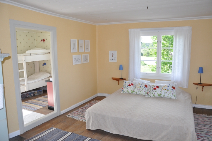 Övervåningen har en hall när man kommer upp för trappan. - Sovrum 1, dubbelsäng (180 cm) med ett mindre anslutande sovrum/barnrum med en våningssäng med 170 cm långa britsar samt en garderob. - Sovrum 2, dubbelsäng (140 cm) samt 2 st garderober. - Sovrum 3, dubbelsäng (140 cm), 2 st enkelsängar (70 cm breda) samt en sittmöbel med soffa och två fåtöljer. En garderob.