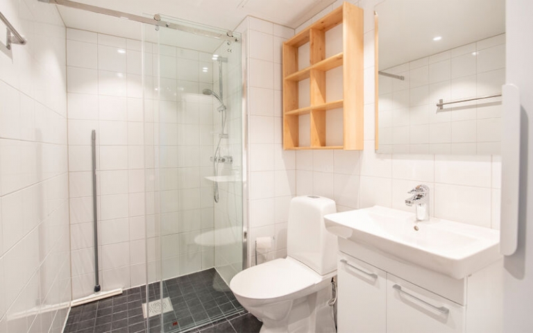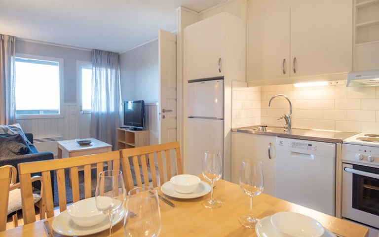 Köket är fullutrustat med bl.a diskmaskin, micro, brödrost, vattenkokare och kaffebryggare. Vidare finns torkskåp, skotork samt gratis Wi-Fi.
