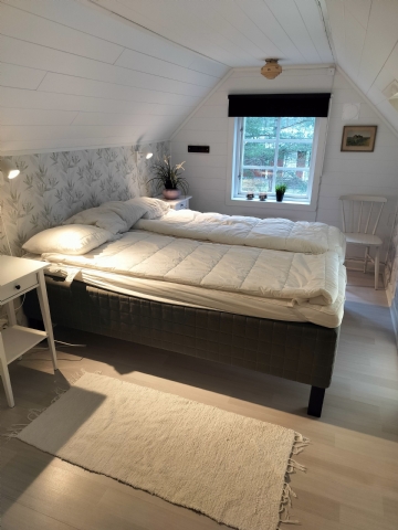 Huset har tre sovrum. Nedervåningen har ett sovrum med 2 nya enkelsängar. Övervåningen har ett sovrum med 2 nya enkelsängar och ett nyrenoverat sovrum med 1 enkelsäng. På övre plan finns också ett allrum med 2 sköna skinnfåtöljer och tv. Täcken och kuddar finns till alla bäddar. Fräscha madrass-skydd till sängarna.