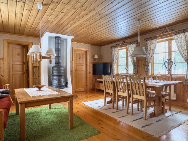 Stugan har allrum med soffgrupp, matgrupp, braskamin och Smart-TV. Wifi (fiber)