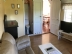 Vardagsrum kombinerat med platt-tv (Led), soffa och våningsäng Ett sovrum med dubbelsäng.