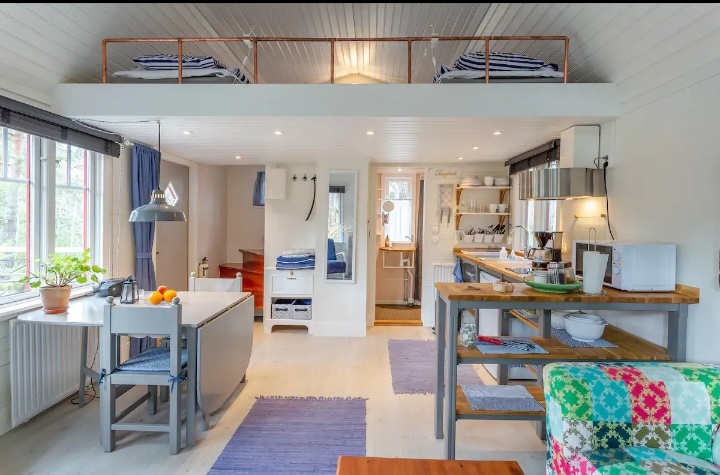 Separat sovloft. Fullt utrustat kök (ej vanlig ugn). Parkering på tomten.