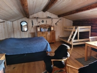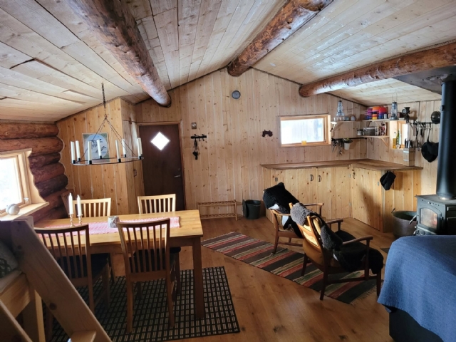 - Ingen el. - Inget rinnande vatten. - Det finns utedass. - Timmerstugan är på 35 kvm och har en öppen planlösning. - Timmerstugan är möblerad och utrustad med sängar, köksbord, stolar och två fåtöljer. - Det finns sängplatser för 4 personer. En dubbelsäng och en våningssäng. Våningssängen har en 120 cm och en 90 cm säng. Det finns 4 täcken, och 4 kuddar. - Köksdelen består av en bänkyta där du förbereder all mat för att sedan tillaga den över öppen eld på grillgaller, Muurika eller tillhörande gasplatta inne i stugan. - Det finns matkåsor, drickskåsor, bestick och all annan köksutrustning som behövs. - I uthyrningen ingår ett litet campingkylskåp som rymmer dagsbehovet av mat. Under vinterhalvåret står kylskåpet utomhus och kyls naturligt. När utomhustemperaturen höjs under vår- och sommar, är det hyresgästens ansvar att hantera all nedkylning och förvaring av mat. Det finns ingen möjlighet till elektrisk nedkylning av matvaror i stugan. - Diskning sker alltid utomhus pga risken att skada inredning vid vattenanvändning inomhus. Instruktion och allt du behöver för diskning finns i stugan. - Verandan är möblerad och där kan du vistas i alla väder och säsonger. - Värmetåliga grillvantar som du använder när du lagar mat utomhus. - Det finns ett portabelt gaskök, med en gasplatta för matlagning. - Städning vid avresa ombesörjs av hyresgästen. Allt för städningen finns i stugan.