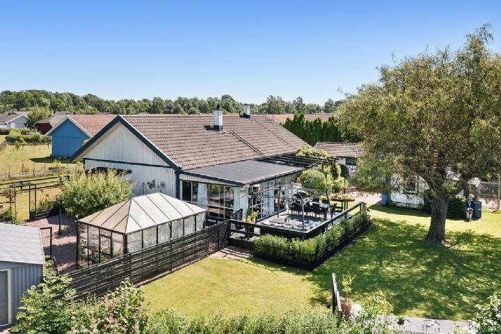Vardagsrum m. soffa, fåtöljer och matplats med plats för 8 personer Kök m. köksbord för 4 pers. Fullt utrustat. 2 badrum varav 1 med dusch. Tvättstuga/groventré m. tvättmaskin. Sovrum 1: Dubbelsäng 180cm(sängarna går att separera) Sovrum 2: Dubbelsäng 180cm(sängarna går att separera) Sovrum 3: Enkelsäng 90cm (extrasäng kan sättas in) Sovrum 4: Enkelsäng 90cm Uterum möblerat Terrass med bord för 8 personer & loungesoffa
