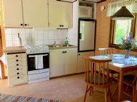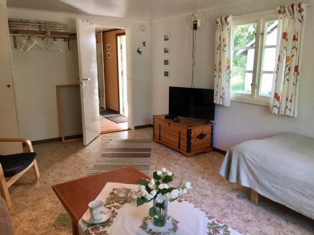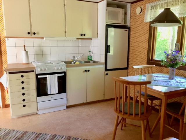 I stugan finns välutrustat kök m spis, kyl, frysfack, microvågsugn, kaffebryggare. Vardagsrum m 1 bäddsoffa (2 bäddar), samt 1 resårbädd, TV (markbundna kanaler), WC och duschrum.