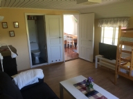 Vardagsrum kombinerat med platt-tv (Led), soffa och våningsäng Ett sovrum med dubbelsäng.
