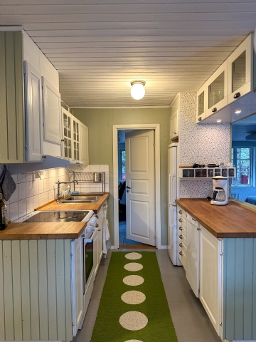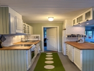 Huset är välutrustat, med både disk- och tvättmaskin, och har öppen planlösning mellan kök och vardagsrum. Det finns tre sovrum, två med dubbelsäng och ett med en våningssäng.