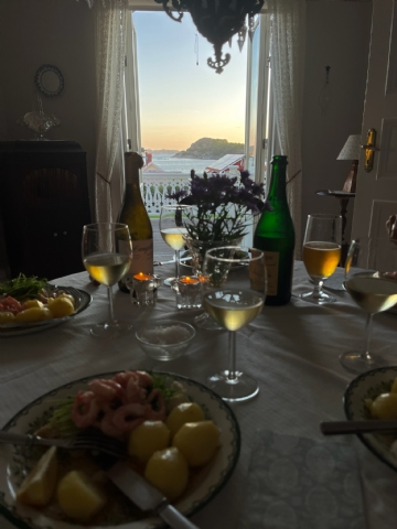 I entréplan ryms det charmiga köket med matplats för 6+ personer, det rymliga och vackra vardagsrummet med kakelugn och utgång till stor solig terrass samt ett sovrum med dubbelsäng (2*200*90), också det med kakelugn och havsutsikt. Därutöver finns bl.a. ett badrum med wc och badkar.