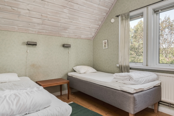Sovrummet har två 90cm sängar, sängbord, garderob och ett hopfällbart skrivbord.