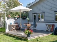Uteplats Uteplatsen nås från köket. Den är byggd med trätrall och har utemöbler samt grill. Solen ligger på från lunch och framåt kvällen.