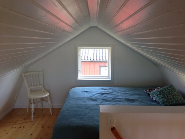 Stugan ligger högt på Hälsö, med en egen altan och strålande havsutsikt ut mot Hälsö hamn, Björkö och Björkö-fjorden. Stugan är på två våningar. På nedre våningen finns ett allrum/matrum med bord och stolar för 4 personer, ett välutrustat kök och ett helkaklat badrum med toalett, dusch och tvättmaskin. Via en liten trappa kommer du upp på övervåningen, som är ett stort rum som delas av i mitten av trappan. Till höger om trappan finns en dubbelsäng med plats för 2 personer (180 cm) och till vänster står en dagbädd med soffbord. Dagbädden kan användas som soffa eller enkelt byggas om till två ytterligare sovplatser, med riktiga madrasser (ingen bäddsoffa!). På hela övervåningen är det snedtak och därför har stugan rent tekniskt inte 30 kvm utan är något mindre. Wi-fi finns i stugan och är inkluderad i veckohyran under högsäsongen. Under lågsäsongen kan eventuellt wi-fi erbjudas, hör efter vid bokning.