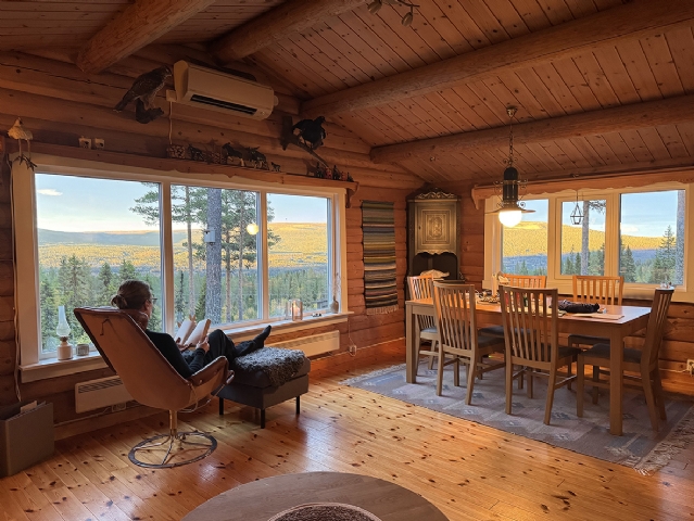 Timmerstuga med storslagen utsikt. Storstuga med matgrupp, soffhörn, smart-tv och braskamin. Torr ved ingår. Fyra sovrum med totalt 8 bäddar. Dubbelsäng i ett av sovrummen. Litet kök av äldre modell. Duschrum med bastu. Separat toalett med tvättställ. Stor solaltan. Hund tillåten.