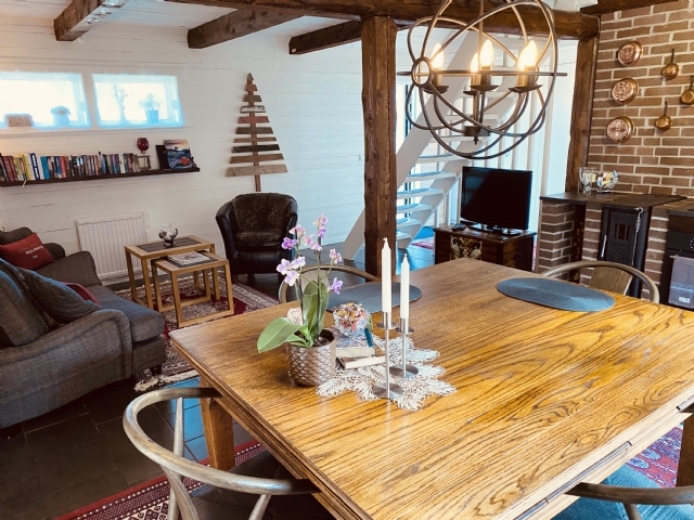 Stugan / lägenheten är på 70 m2 (öppen planlösning) med sovloft. På sovloftet finns en dubbelsäng (180 cm bred). Den tredje bädden är en extrasäng som vi sätter in på sovloftet. På baksidan av huset finns gräsmatta och en stenlagd altan med sköna utemöbler, (helt avskilt) mot skogen. Köket är utrustat med varmluftsugn, spis, mikro, kyl och frys, kaffebryggare, samt de flesta husgeråd som ska finnas i ett kök. I köksdelen finns också en vedeldad kamin. Under sommarmånaderna finns en aircondition på sovloftet. I stugan finns tv och wifi (vi har fibernät). i det stora badrummet finns toalett, duschkabin och tvättmaskin. Handdukar, sänglinne, el, ved, wifi och slutstädning ingår i priset. Inga extra avgifter tillkommer.