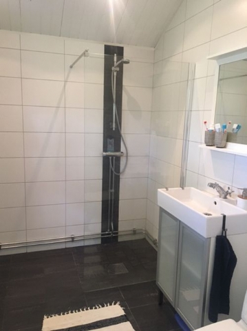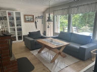 Modernt (kaklat) badrum med golvvärme. Stor altan. Stugan ligger idylliskt ca 100 meter från havet med egen brygga.