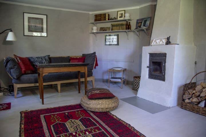 Med bara ängen som granne är det garanterat lugna nätter. Här bor det naturälskande paret bekvämt och inredningen är enhetlig och modern och en dröm för den som är intresserad av byggnadsvård.