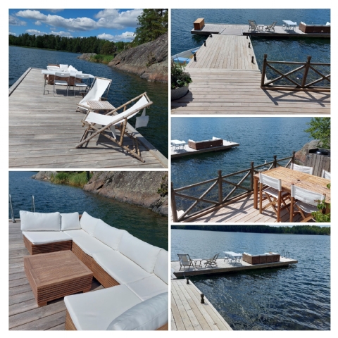En stor brygganläggning med loungegrupp, grill m.m.
