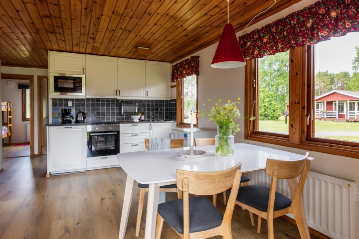 Området är mycket barnvänligt med stora gröna ytor, lekplats, småcyklar och tennisbana. Omgivningen är synnerligen lämplig för Dig som söker stillheten och närheten till naturen. 2 km till Bödabuktens milslånga sandstrand. Många utflyktsmål. Roddbåt och tennisbana ingår.