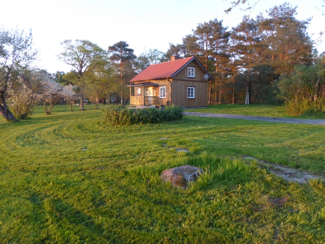 Runt huset finns en trädgård med frukträd, syrenberså och trädgårdsmöbler, utanför trädgården betar kossor på sommaren.
