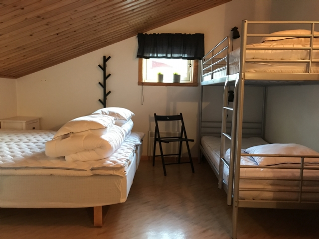 Stugan har det viktigaste – bastu, altan och grill! Men även åtta bäddar fördelat på två sovrum och ett mysigt loft.