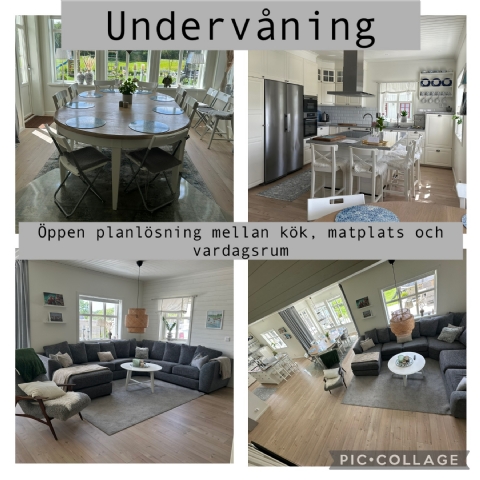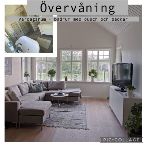 INSIDAN Undervåning: 1st sovrum med dagbädd (dubbelsäng med 2st sovplatser) Öppen planlösning med vardagsrum, matplats med plats för 8st sittplatser vid matbord (matbordet förlängs vid uthyrningen med iläggsskiva jämfört med bilderna) samt 4st vid köksön, och kök med köksö, badrum med dusch, tvättstuga med tvätt och torkmaskin.
