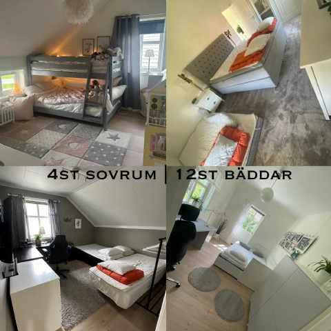 Övervåning: (3st sovrum med totalt 10 sovplatser), vardagsrum, badrum med dusch och badkar 3 sovrum på övervåning: 1. Dubbelsäng 210*210 + samt madrass 120cm på golvet intill dubbelsängen 2. 2*90 enkelsängar 3..Familjevåningssäng 120+90cm + extrasäng 90cm som är flyttbar,
