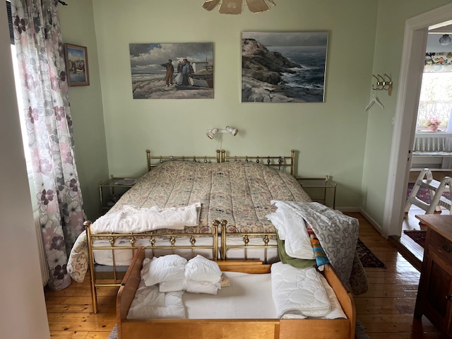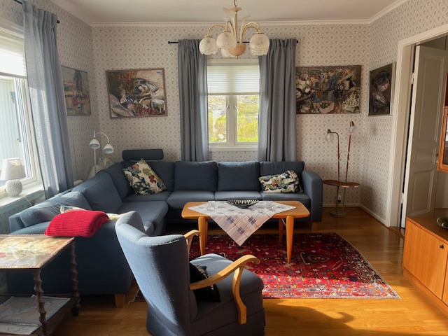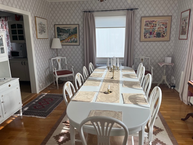 Första våningsplan är på ca 95 m2 och uppdelat på hall/tambur (bild 4,5), badrum med tvättmaskin (bild 6), kök (bild 7), sovrum (bild 10), vardagsrum (bild 9) och matsal med stort matbord och 10 stolar (bild 8). Rummen är ganska stora och högt till tak. Sovrummet här har en 180 cm dubbelsäng och vardagsrummet en stor hörnsoffa som också är en bäddsoffa. Med bäddsoffan räknar vi på fyra bäddar i första våningen.