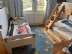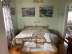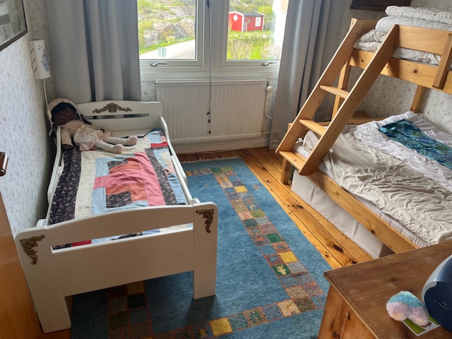 Andra våningsplan har en yta på ca 85 m2. Det är uppdelat på hall (bild 11), toalett (bild 12), kök (bild 13), vardagsrum (bild 14) och fyra sovrum. Alla rummen här är nyrenoverade. Där finns också en stor balkong med utemöbler och förmiddagssol. I första sovrummet finns en 140 cm dubbelsäng (bild 15). Nästa sovrum har en familjesäng och en barnsäng (bild 16). Familjesängen är en våningssäng som är 120 cm bred i nedre sängen och 80 cm i den övre. De två övriga sovrummen har 120 cm sängar (bild 17, 18). Sammanlagt räknar vi med sex bäddar i övre våningen. Totalt har huset således fem sovrum och 10 bäddar, alla med fönster och egen dörr. Även vardagsrummet nedre plan med bäddsoffan har dörrar som kan stängas utan genomgång.