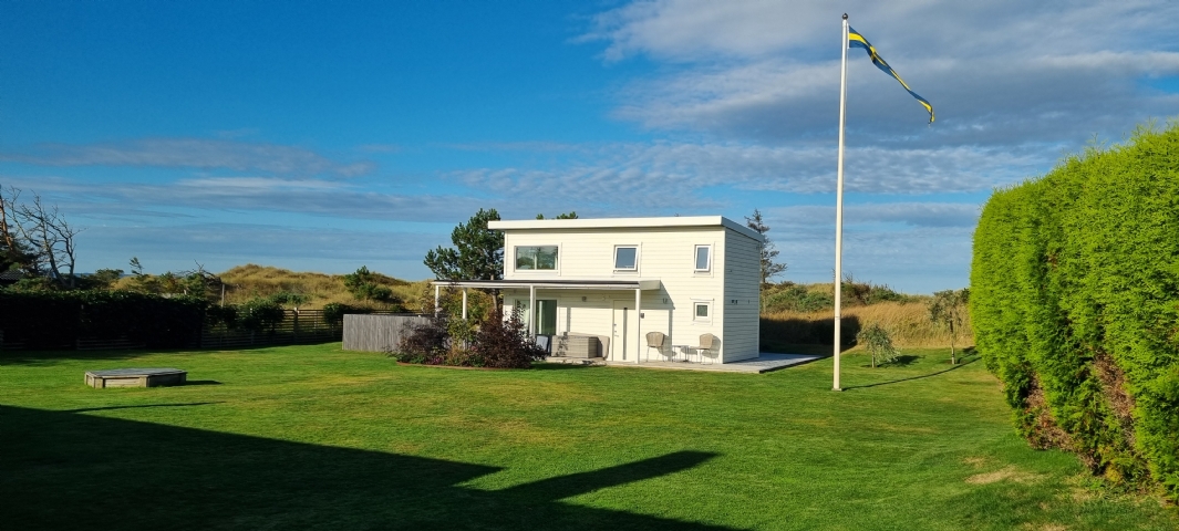 Nybyggt Attefallshus som ligger i norra Mellbystrand och gränsar till sanddynerna endast 50 m från havet med 4 sovplatser på loft, kök med vardagsrum, toalett med dusch och tvättmaskin. Under lågsäsong 1-24 och 37-52 hyrs Attefallshuset ut separat för 8500kr/vecka och 1400kr/dygn. En promenad på 5 min tar er till strandhotellet, med trevlig minigolfbana, restaurang med underhållning samt andra restauranger. Naturreservat med motionsslingor (elbelyst) och terrängcykel spår finns på 10 min promenadväg. Tennis och paddel banor finns på 4 km avstånd. Vallåsens bike park, Skogaby golfklubb(20 km), go-kart, laxfiske med mera finns i närheten. Avståndet med bil till Laholm (10 min), Båstad (15 min) och Halmstad (20 min). Lakan och handdukar ingår inte i priset, men kuddar och täcken finns. Under högsäsong, vecka 25-36 hyr vi helst ut Stugan objekt 4372 och Attefallshuset tillsammans. Bra för generations boende eller flera familjer. Pris högsäsong 15000 kr/vecka för stugan och 11500 kr/vecka, 1700 kr/dygn för Attefallshuset