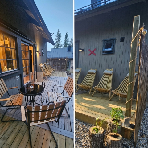 På husets baksida finns altan med solläge med vilstolar, matbord och om så önskas grill.