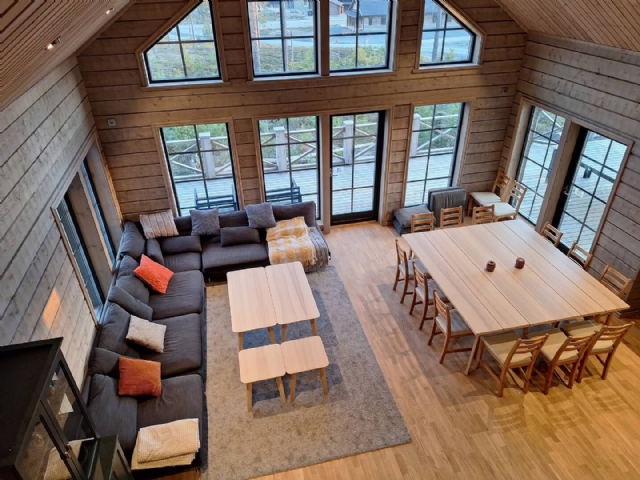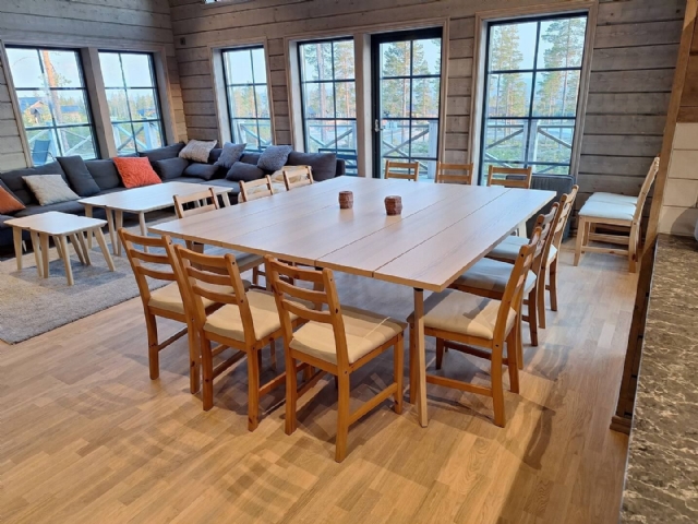 Storstuga • Stor hörnsoffa med bord • Matbord och stolar med plats för 16 personer • Braskamin • 55 tums TV • Vitrinskåp • Två dörrar ut till terrass • Parkettgolv, rustika timmerpanelväggar och paneltak • 39,0 m²