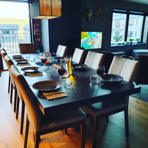 Ett öppet och modernt kök, med bl.a. kyl och frys, spis med ugn, diskmaskin, mikrovågsugn, kaffebryggare, vattenkokare, elvisp och brödrost. Förutom barnstol finns i detta boende också en juniorstol.