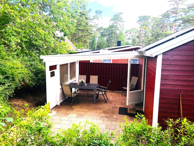 Öppna altandörren och stig ut på den stora och insynsskyddade uteplatsen (15m2). Utemöblerna och klotgrillen lockar till sköna måltider och trivsamma stunder under bar himmel. Halva uteplatsen är under tak, skönt när solen skiner som starkast eller det kommer ett sommarregn.