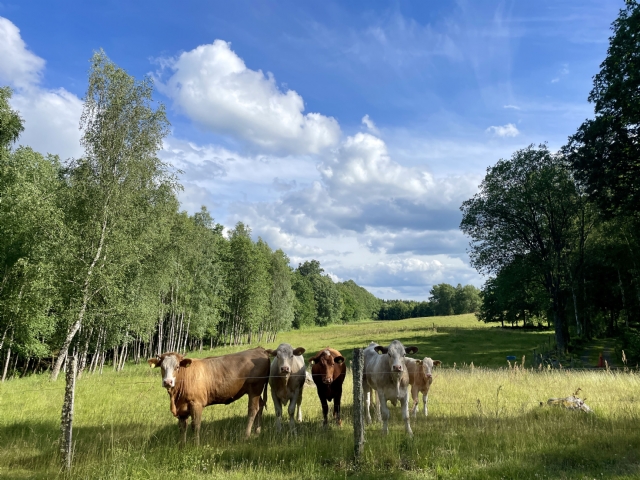 Andra våningen består av ett sovrum med två enkelsängar och utsikt över ängen, samt rum med en bäddsoffa för två personer.