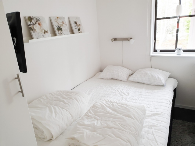 2 sovrum, ett med 4 bäddar i våningssäng (90 cm) och ett med dubbelsäng.