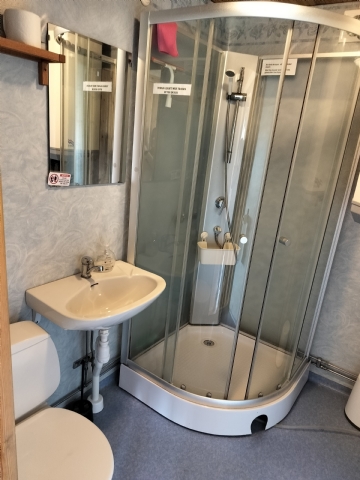 Inglasad veranda med ett matbord till. Badrum med duschkabin & WC. Denna stuga kallas för Stuga 7