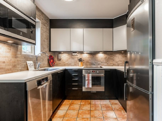 Välutrustat kök med kyl/frys, mikrovågsugn och diskmaskin.