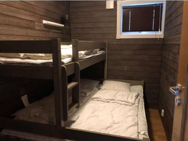 Ett av sovrummen har dubbelsäng och de två andra har våningssäng med en bred undre säng(140cm bredd)med plats för två i bredd om man vill, därutöver finns en bred bäddbar soffa på övervåningen.