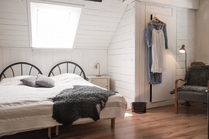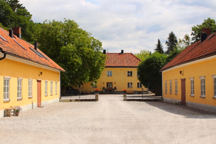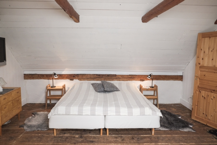 På vindsloften i två flyglar har vi inrett lägenheter, det förhöjda taket med synliga bjälkar och ljusa färger skapar rymd och luftighet. Utanför fönstret svajar stora träd. Lägenheterna består av ett rum med 4 sängar samt dusch och wc. Köksdelen har all vanlig utrustning som spis, kylskåp, frys, kaffebryggare och mikro. Totalt finns fem lägenheter med plats för fyra personer i varje, varav en belägen på bottenplan. Gemensam uteplats med grill. Ej hund och katt, rökfritt. (Bilderna är tagna i olika lägenheter)