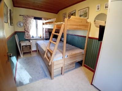 Sjöutsikt! Öppen spis med braskamin i allrummet. Ved ingår i hyran. TV finns i allrum och sovrum. Våningssäng i sovrum och bekväm bäddsoffa i allrummet. Täcken och kuddar att låna ingår i hyran.