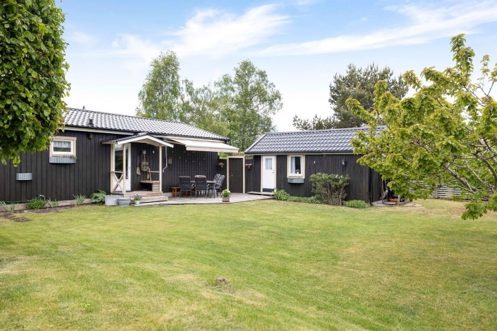 2 trädäck, ett på framsidan och ett på baksidan med flera sittgrupper. Kolgrill finns. Baksidan har en gräsmatta för utelek.