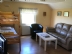 Vardagsrum kombinerat med platt-tv (Led), soffa och våningsäng Ett sovrum med dubbelsäng.