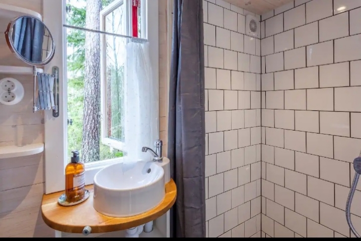 Alldeles för sig själv, längst bort på vår tomt ligger vår lilla stuga i en skogsglänta. Här är lugnt och tyst. Bara natur och på badrocksavstånd finns en varm badsjö. Hela området genomkorsas av härliga promenadstråk och det är en knapp km ner till havsviken. Herrbret, som vi kallar stugan, har en härlig altan i solläge på framsidan. Allt är fräscht och nybyggt i gammal stil men med modern standard och utrustning. Stugan är avsedd som en skön avkopplande oas för två personer i naturens närhet.
