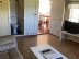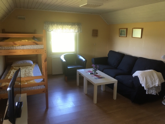 Vardagsrum kombinerat med platt-tv (Led), soffa och våningsäng Ett sovrum med dubbelsäng.