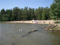 Badplats: 700 m kommunal sandstrand med brygga
