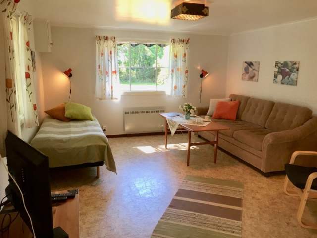 I stugan finns välutrustat kök m spis, kyl, frysfack, microvågsugn, kaffebryggare. Vardagsrum m 1 bäddsoffa (2 bäddar), samt 1 resårbädd, TV (markbundna kanaler), WC och duschrum.