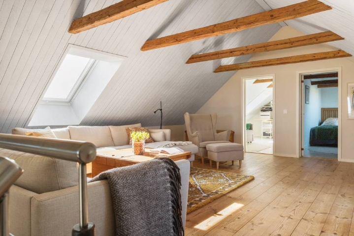 Övervåning med ett stort allrum, två soffor fåtölj och stor TV Två sovrum - ett med en bäddsoffa och ett med en dubbelsäng.