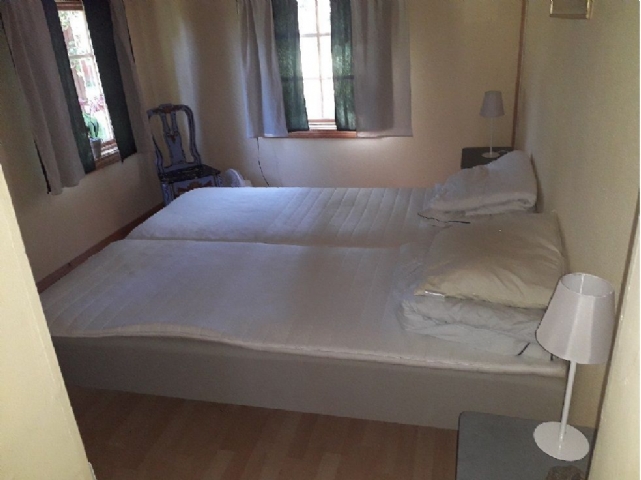 I stugan finns ett separat sovrum med dubbel säng. Samt kök och vardagsrum med bäddsoffa (för 2 pers ) . Inga dörrar mellan rummen .
